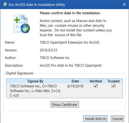 The ArcGIS Pro add-in for TIBCO OpenSpirit® requires ArcGIS Pro version 2.1 or higher and TIBCO OpenSpirit® Runtime version 4.2.0 or higher. The add-in is supported on operating system platforms that are supported by ArcGIS Pro and the OpenSpirit Runtime. Both of these products must be installed prior to installing the add-in.