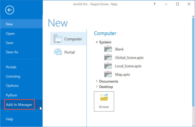 The ArcGIS Pro add-in for TIBCO OpenSpirit® is uninstalled using the ArcGIS Pro Add-In Manager. Click on the Project tab in the ArcGIS Pro tool bar, then click on the Add-In Manager option.
