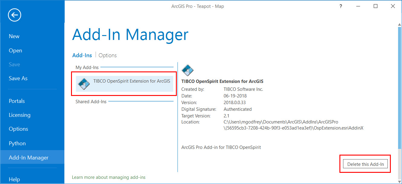 This will open the Add-In Manager window. Select the TIBCO OpenSpirit Extension for ArcGIS add-in and click on the Delete this Add-In button in the lower right corner of the window.