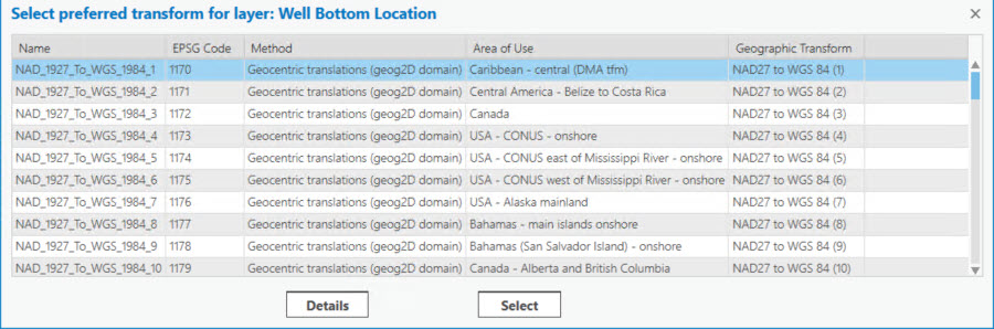 A geographic transform selection window will appear for each layer that has a coordinate system that is not in the WGS84 datum if the map has not been assigned a transform to WGS84.