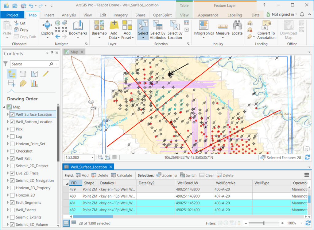 Features created by the TIBCO OpenSpirit Scan Utility will have a field that contains an OpenSpirit datakey. The datakey identifies the database and data item that the feature was created from. Datakeys can be broadcast from ArcGIS Pro to other applications such as Schlumberger's Petrel application and TIBCO's Spotfire application. This is referred to as sending a data selection event. Applications that use OpenSpirit to listen for data selection events will receive the broadcast datakeys and will react. Receiving applications typically react by querying the database that the data items reside in and loading the data.