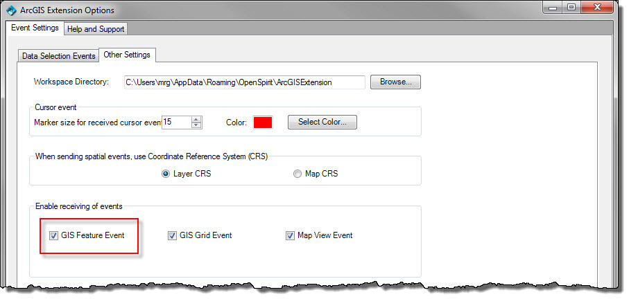 ArcGIS is enabled for listening to GIS events as long as the lightening bolt is enabled on the OpenSpirit toolbar and the "GIS Feature Event" option is chosen in the options dialog: