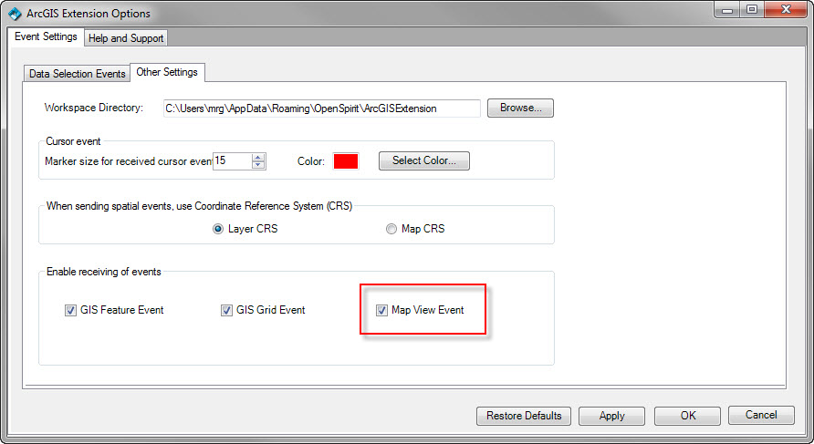ArcGIS is enabled for listening to map view events as long as the lightning bolt is enabled on the OpenSpirit toolbar and the Map View Event option is chosen in the options dialog: