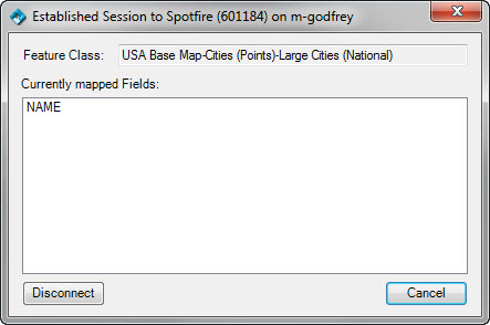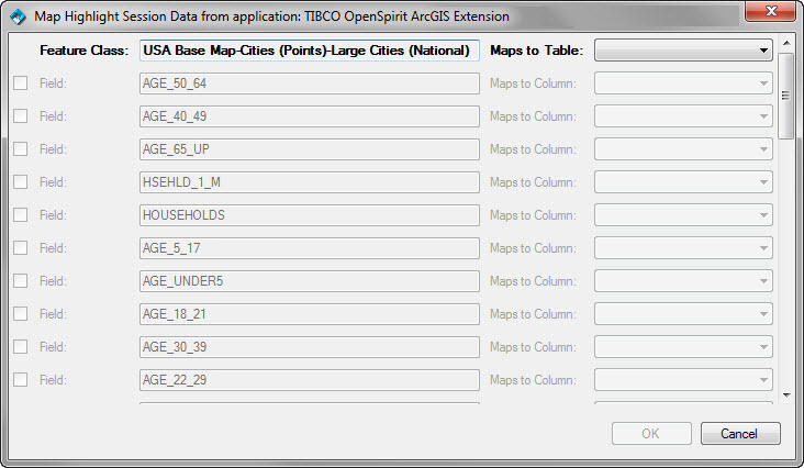 The image below is the highlight session mapping window that appears in Spotfire when initiating the highlighting session from ArcMap. A similar window would appear in ArcMap if the session was initiated from Spotfire.