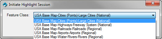 Clicking on the highlighting initiation button in ArcMap causes a window to appear where you are asked which ArcMap feature class you wish to use for the highlighting session.