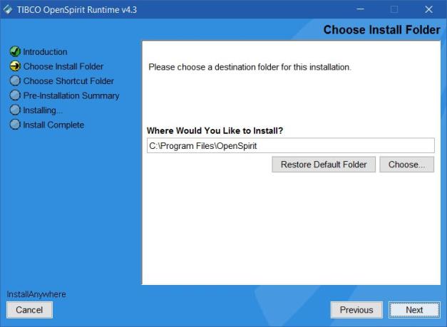 The install folder selection panel is used to select the file folder that the OpenSpirit software is installed in. Click the Choose button to open a folder selection window to navigate to the folder you would like to install the OpenSpirit software into if you do not want to install into the default location. You can also type the folder location directly into the text entry field or you can paste a folder path in using the system copy/paste clipboard.