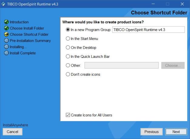 The shortcut folder selection panel only appears when installing on Windows. The panel allows you to choose where you would like to install the Windows shortcut icons used to start the OpenSpirit applications that are installed. Your choices are to create a program group in your Windows Start menu. Use an existing program group. Place them in the top level of the Start menu. Place them on the Windows Desktop. Place them in the Windows quick launch bar, place them in a selected file system folder, or do not create start menu entries anywhere. Most users want the shortcuts in a new program group, on the desktop, or in the quick launch bar.