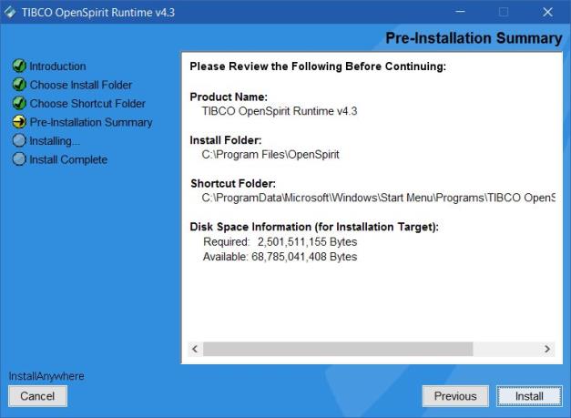 The preinstallation summary panel shows where the OpenSpirit software is installed and where the shortcuts are created if installing on Windows. It also shows the amount of disk space that is required to complete the installation. The required disk space is an estimate made by the installer. The numbers provided in the Disk_Space section of the Installation Requirements section of this guide provide a more accurate estimate of the disk space requirements.