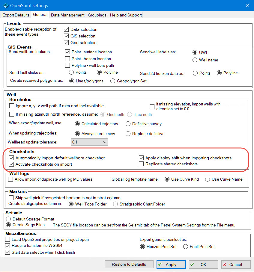 In addition to checking the SRD of checkshots to be imported (discussed in the Seismic Datum Adjustments section) there are three additional options that control how checkshots are imported in Petrel. These are highlighted below: