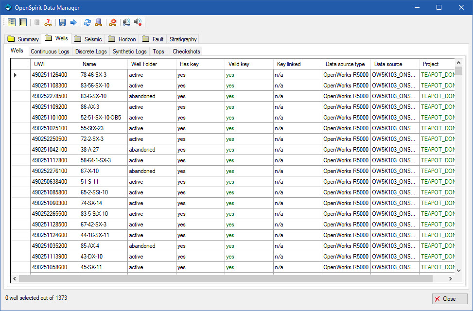 Clicking on the Wells, Seismic, Horizon, or Fault tab allows you to then see a detailed listing of individual objects of a given type: