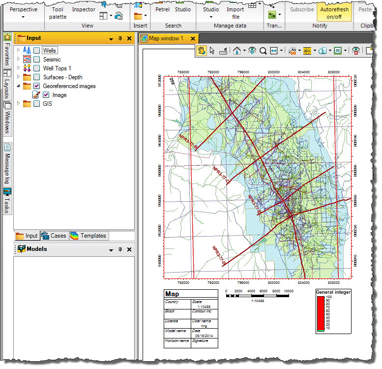 Following is an example of how a received Map Image appears in the Petrel Input tree and in a Petrel map window.