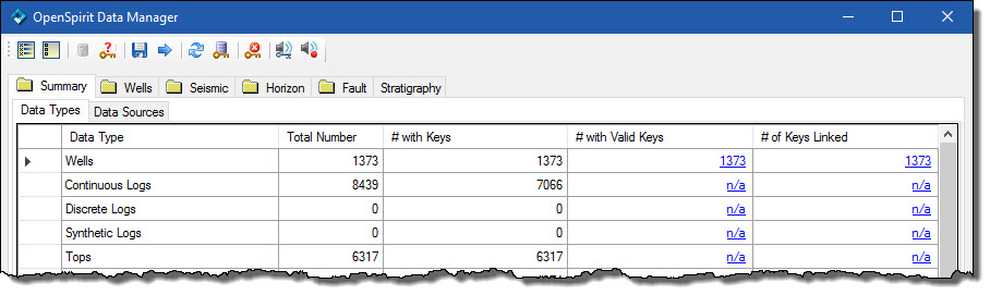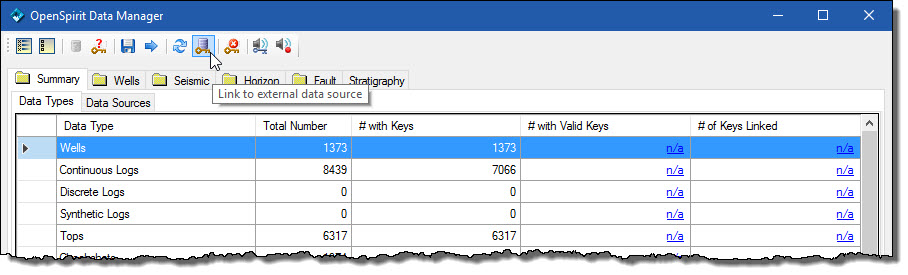 Regardless of whether a Petrel object has a datakey or not, it may be linked to an external project. Select one or more data types (or individual objects from the Well, Seismic, Horizon, or Fault tabs) and click on this button: