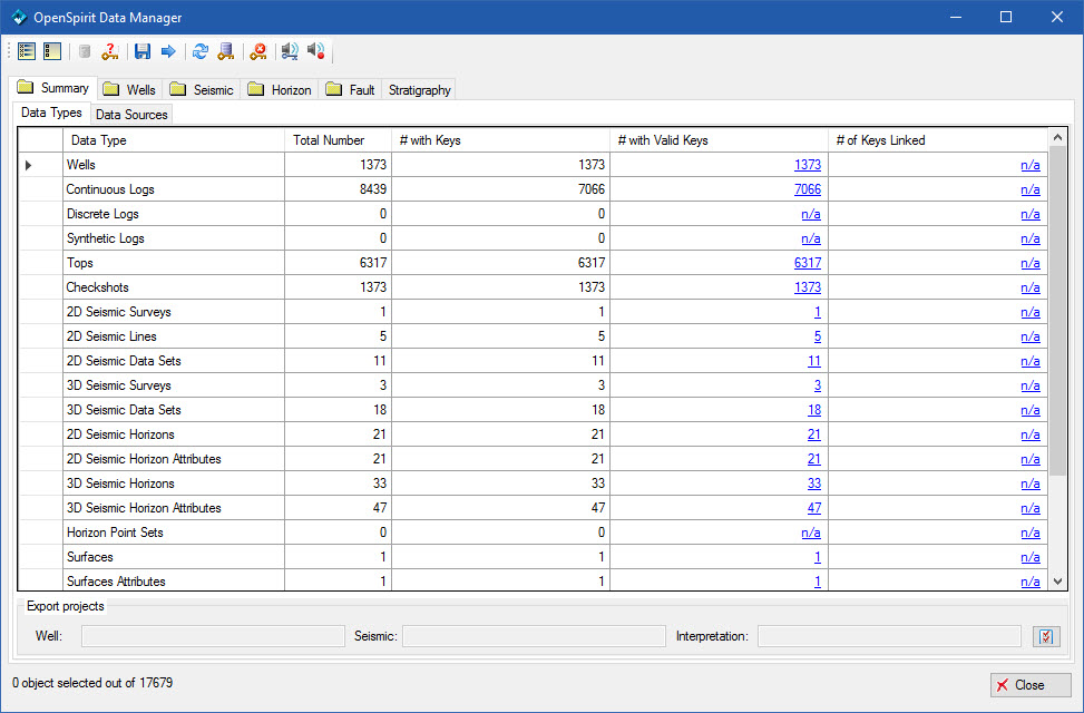 This dialog allows a user to see a summary of all the Petrel objects that may be imported or exported via the OpenSpirit Adapter. It is displayed by selecting the OpenSpirit data manager option from the OpenSpirit ribbon tool: