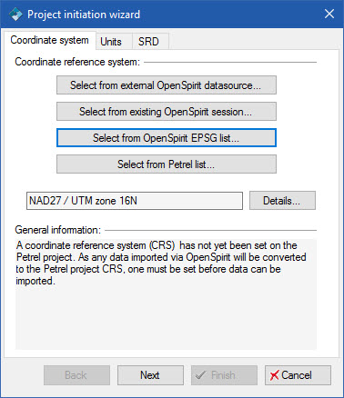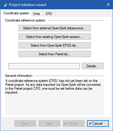 The Project Initiation wizard forces you to choose a coordinate reference system (CRS) to use for the Petrel project. As shown in the Project Initiation wizard, you have four different methods of selecting the CRS. A CRS must be set before importing or exporting data via OpenSpirit as OpenSpirit automatically does any required coordinate transformations and must know the CRS of the Petrel project.