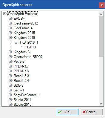 In this option you select an existing external project (e.g. an OpenWorks , GeoFrame, Kingdom, etc... project) and then OpenSpirit will connect to this project and read its CRS details.. This CRS will then be used as the Petrel project CRS. This option allows you to use any standard predefined or custom CRS that may be defined in the external project.