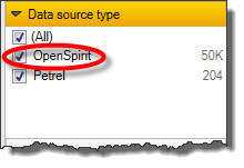 The OpenSpirit data source type will appear in the Data source type search filter in Petrel if you have included an index that was created using TIBCO OpenSpirit Scan for Studio Find.