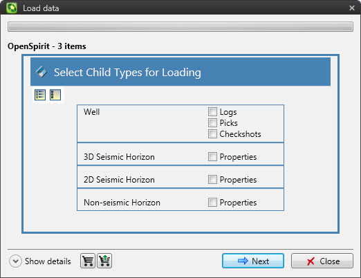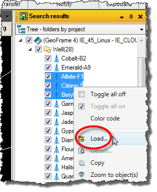 Data may be imported using the Load feature in a Studio Find search result. Select items in a search result, right click to bring up the context menu, and select the Load... option. The Studio Find search index must have been created using the TIBCO OpenSpirit Scan for Studio Find product for the data to be loaded using the OpenSpirit Adapter.