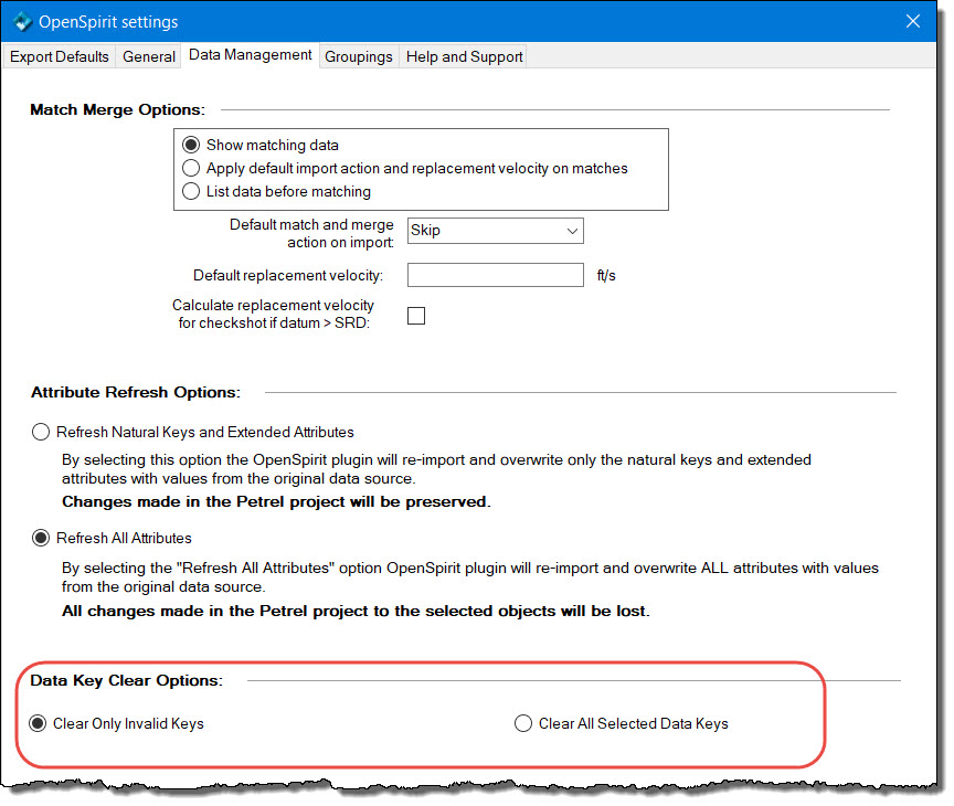 This setting in the Data Management tab of the OpenSpirit settings dialog determine whether all datakeys for the selected objects will be cleared or just the invalid keys (the default).