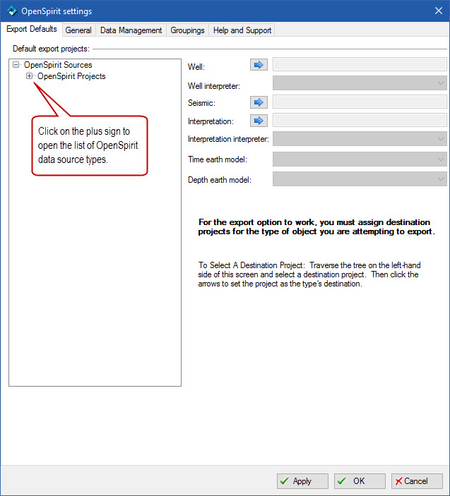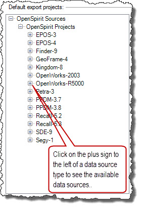 Click on the plus sign to the left of OpenSpirit Projects to expand the list of available OpenSpirit data source types.