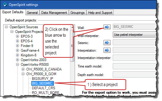 Select a project and then click on the blue arrow button for Well, Seismic, and Interpretation to assign the export destination project for well data, seismic data, and interpretation data.