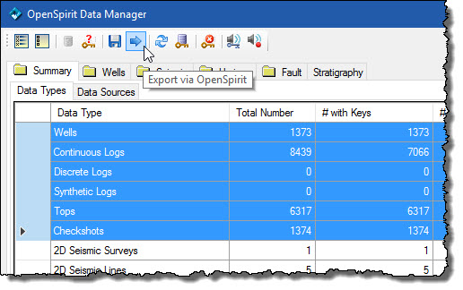Regardless of whether a Petrel object has a datakey or not, it may be saved to an external project. Select one or more data types (or individual objects from the Well, Seismic, Horizon, or Fault tabs) and click on this button: