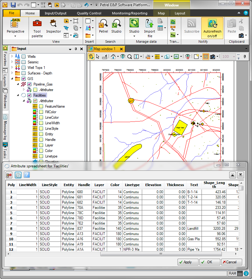 Following is an example of how received GIS features appear in the Petrel Input tree and in a Petrel map window.