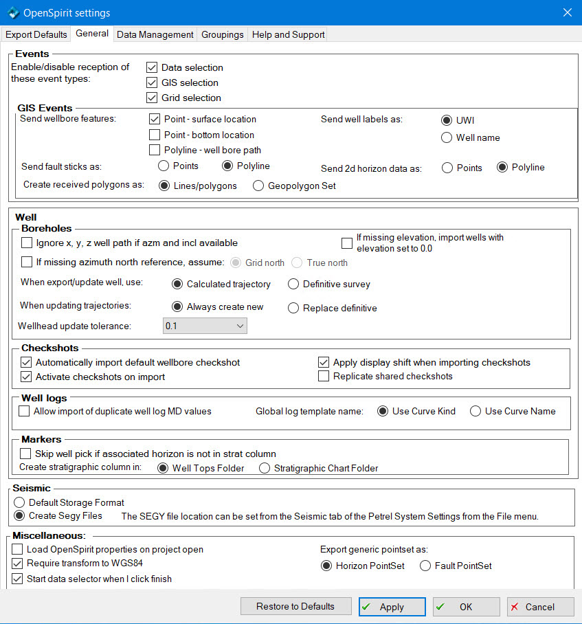 Option to automatically start the OpenSpirit data Selector after the Project Initiation Wizard is finished or after connecting to OpenSpirit from an existing Petrel project. The OpenSpirit adapter will either use an existing or create a new OpenSpirit session called Petrel_ProjectName that has its CRS and units set to the Petrel project preferences.