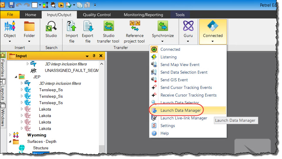 This dialog allows a user to see a summary of all the Petrel objects that may be imported or exported via the OpenSpirit Adapter. It is displayed by selecting the OpenSpirit data manager option from the OpenSpirit ribbon tool: