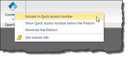 You can add the OpenSpirit ribbon icon to the Petrel quick access toolbar by right clicking on the OpenSpirit ribbon icon and selecting the Include in Quick access toolbar option.