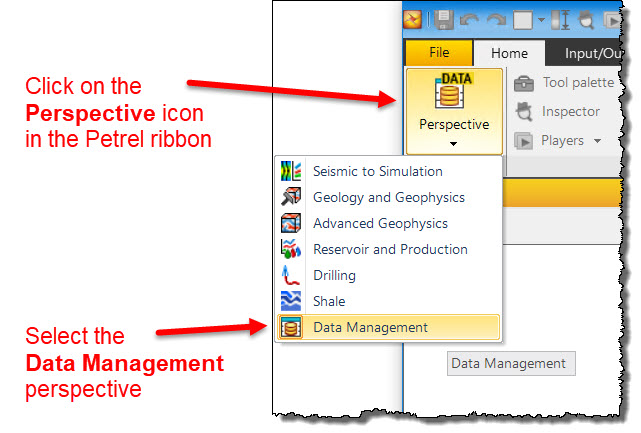 The OpenSpirit Adapter tool bar is located in the Data Management perspective in the Petrel ribbon. Click on the Perspective icon and select the Data Management perspective.