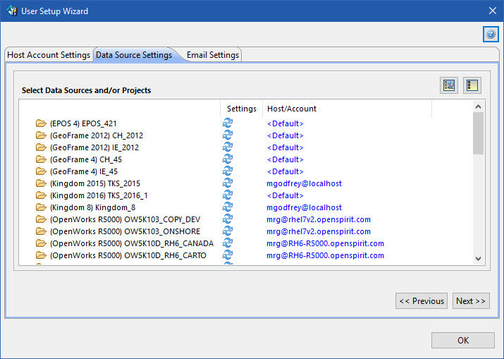 The User Setup Wizard will walk you through setting up a new OpenSpirit user account and configuring your data server activation settings. This is done the very first time that you connect to OpenSpirit.