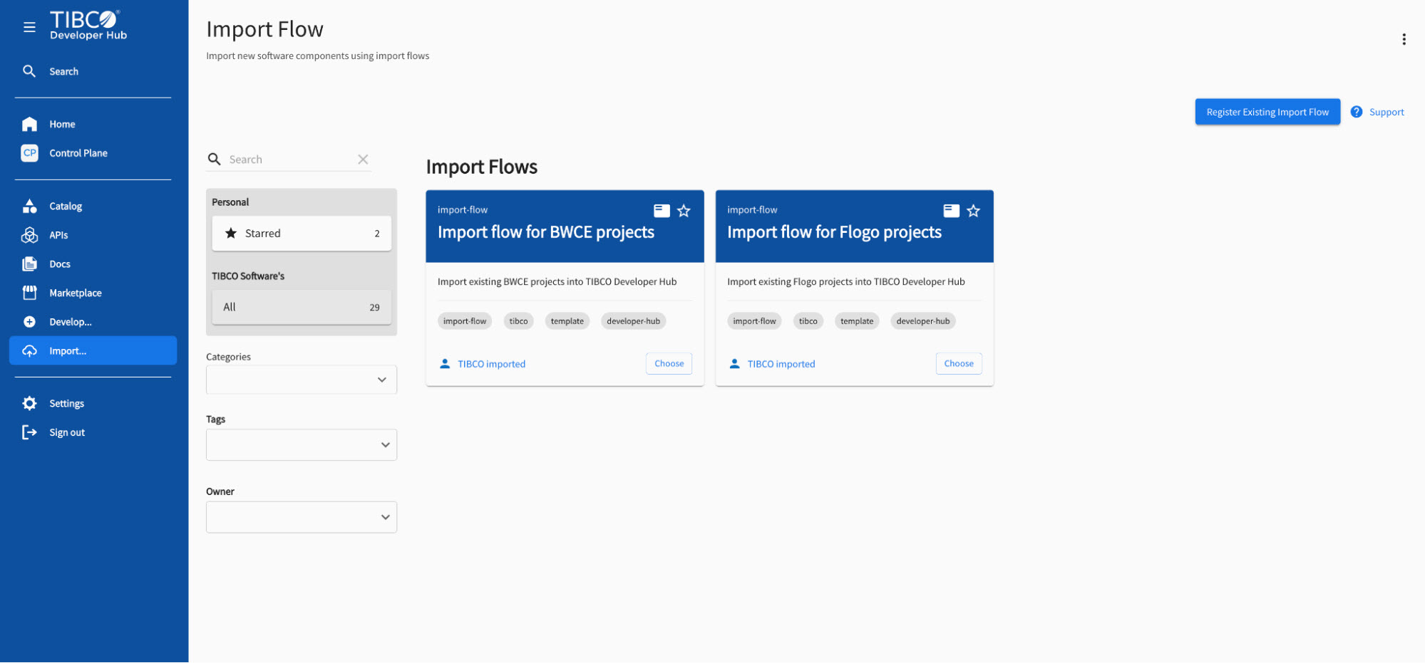 Import flows are the same as templates with the tags: import-flow. You can import new entities like components, templates, APIs, and more, in TIBCO Developer Hub using import flows.