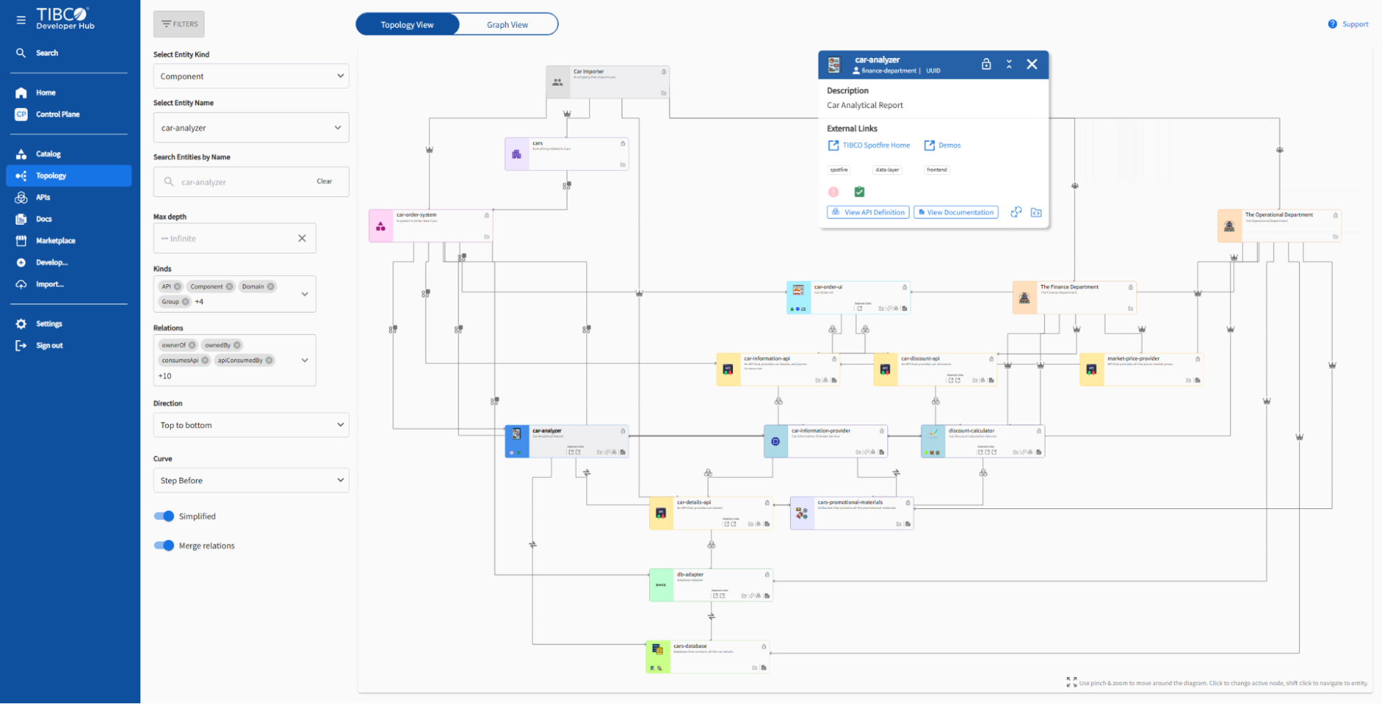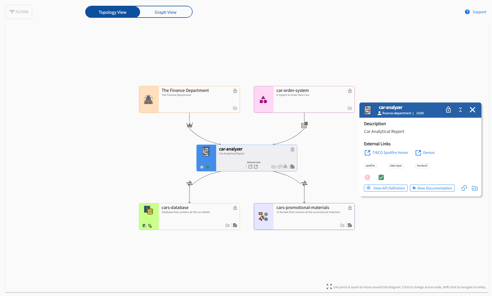 Topology Page showing a component with various filters to explore entity information and relationships
