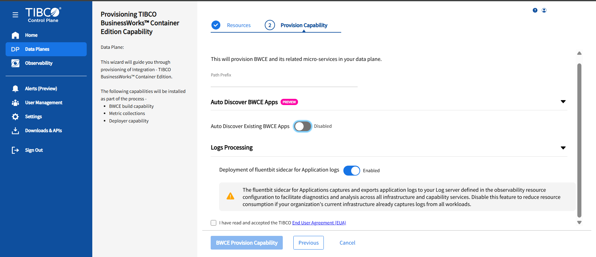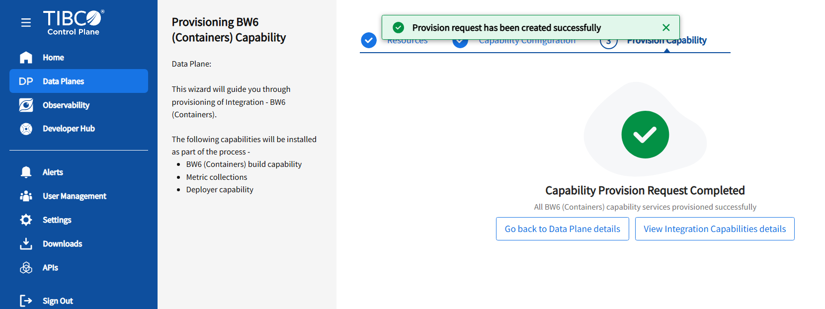 You can provision the TIBCO BusinessWorks™ 6 (Containers) capability from TIBCO Control Plane. To provision the TIBCO BusinessWorks6 (Containers) capability, ensure that you have a registered data plane in TIBCO Control Plane. For more information, see Registering a Data Plane.
