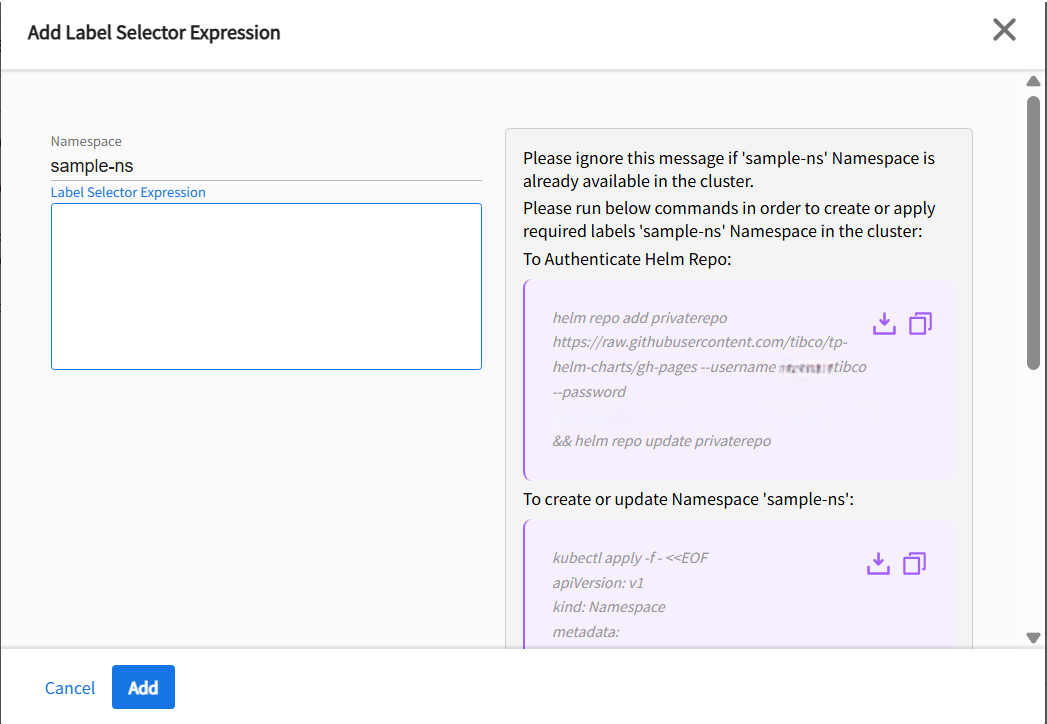 Also, you can add a new expression by specifying the Namespace and the Label Selector Expression. Execute the commands as shown in the UI to manage the Namespace.
