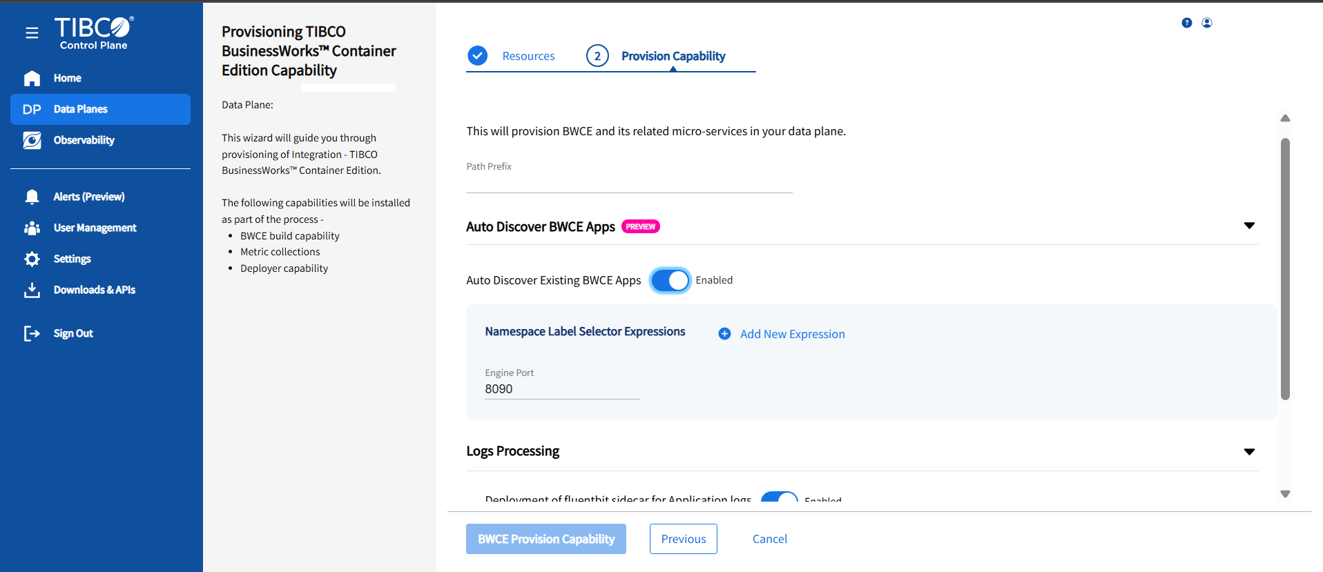 - To enable the Auto Discover BWCE Apps option, use the toggle button. Note: This is a Preview feature. By using the Auto Discovery feature, you can fetch your existing BWCE apps from the same K8s cluster deployed using the Helm chart and monitor those applications from TIBCO Control Plane UI. Application resources must have the following required labels:By default, the Auto Discover BWCE Apps option is disabled.
