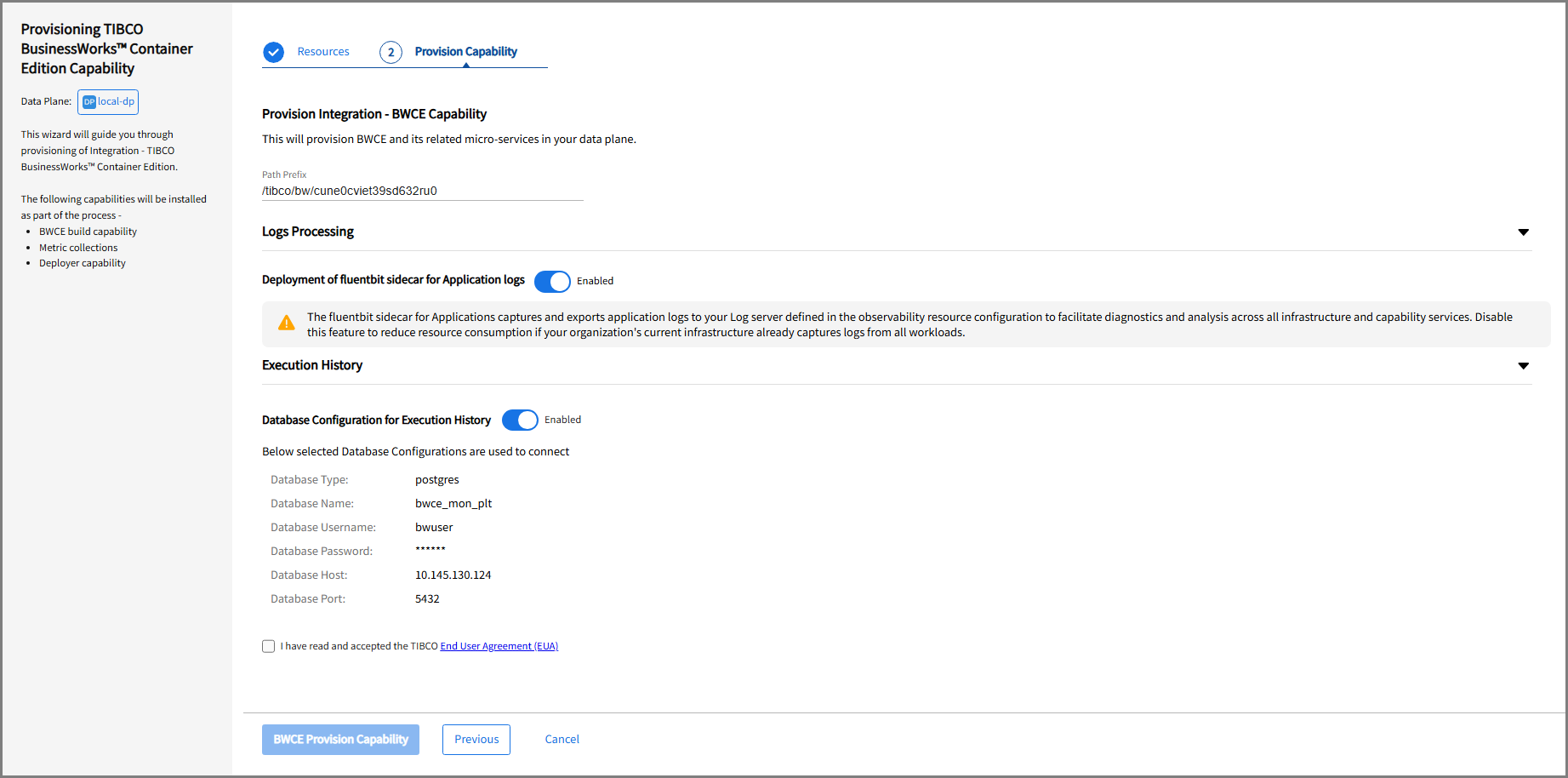 - Select the EULA checkbox to accept the End-User License Agreement. Note: (Optional) You can customize the recipe configuration to adjust provisioning settings for your BW6 (Containers) capability. Changes made here override default values when the capability is provisioned.