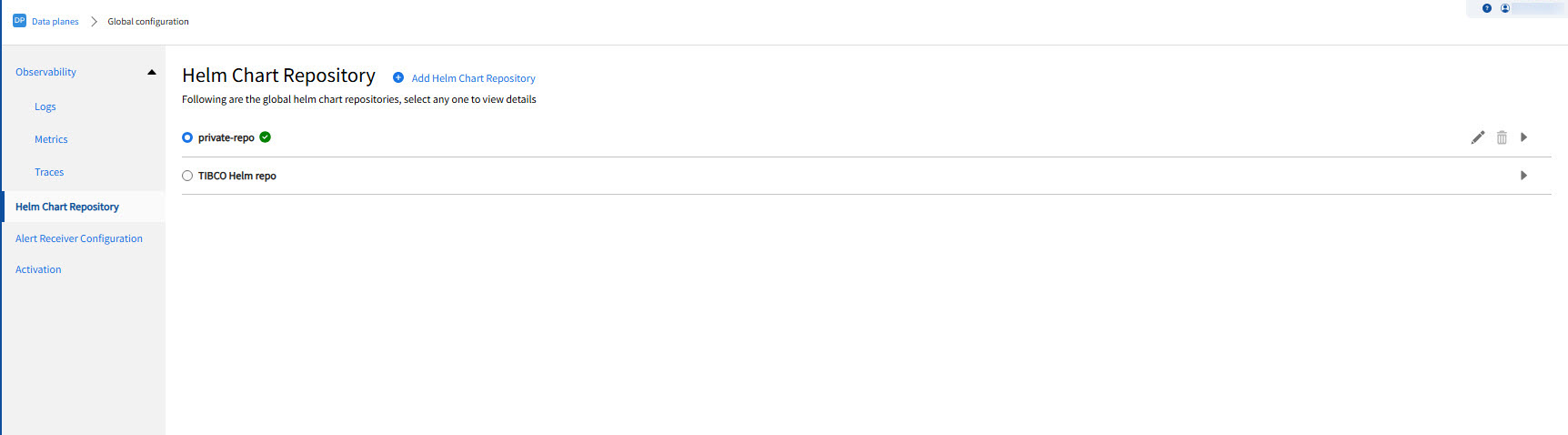 Click Data Plane Configuration and then navigate to the Helm Chart Repository page.
