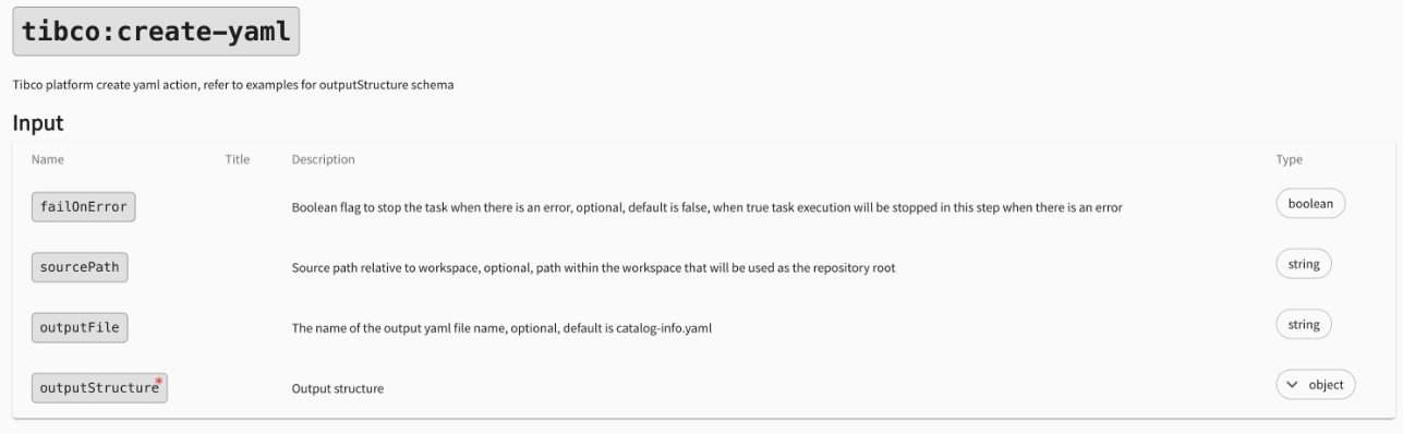 Example Sample Code Create a yamlfile with example outputStructure.steps: - action: tibco:create-yaml name: Create yaml file input: failOnError: true sourcePath: <Source path> outputFile: <output-file.yaml> outputStructure: apiVersion: backstage.io/v1alpha1 kind: "Component (You can change this to any TIBCO Developer Hub entity, ex: API, Resource, System)" metadata: name: <${{ steps.extract.output.extract_parameter_name[0]}}> description: <${{ steps.extract.output.extract_parameter_desc[0] }}> tags: - <Tag1> - <Tag2> annotations: github.com/project-slug: <${{ "https://" + (parameters.repoUrl | parseRepoUrl).host + "/" + (parameters.repoUrl | parseRepoUrl).owner + "/" + (parameters.repoUrl | parseRepoUrl).repo }}> backstage.io/techdocs-ref: dir:. links: - title: <Link title> url: <Link URL> spec: type: <Type of the application> lifecycle: production owner: <${{ parameters.owner }}>Create yaml file with example outputStructure accepting multiple catalog entity as array steps: - action: tibco:create-yaml name: Create yaml file with multiple catalog entity input: failOnError: true sourcePath: <Source path> outputFile: <output-file.yaml> outputStructure: - apiVersion: backstage.io/v1alpha1 kind: "Component1 (You can change this to any TIBCO Developer Hub entity, ex: API, Resource, System)" metadata: name: <${{ steps.extract.output.extract_parameter_name[0] }}> description: <${{ steps.extract.output.extract_parameter_desc[0] }}> tags: - <Tag1> - <Tag2> annotations: github.com/project-slug: <${{ "https://" + (parameters.repoUrl | parseRepoUrl).host + "/" + (parameters.repoUrl | parseRepoUrl).owner + "/" + (parameters.repoUrl | parseRepoUrl).repo }}> backstage.io/techdocs-ref: dir:. links: - title: <Link title1> url: <Link URL1> spec: type: <Type of the application1> lifecycle: production1 owner: <${{ parameters.owner1 }}> - apiVersion: backstage.io/v1alpha1 kind: "Component2 (You can change this to any TIBCO Developer Hub entity, ex: API, Resource, System)" metadata: name: <${{ steps.extract.output.extract_parameter_name[1] }}> description: <${{ steps.extract.output.extract_parameter_desc[1] }}> tags: - <Tag3> - <Tag4> annotations: github.com/project-slug: <${{ "https://" + (parameters.repoUrl | parseRepoUrl).host + "/" + (parameters.repoUrl | parseRepoUrl).owner + "/" + (parameters.repoUrl | parseRepoUrl).repo }}> backstage.io/techdocs-ref: dir:. links: - title: <Link title2> url: <Link URL2> spec: type: <Type of the application2> lifecycle: production2 owner: <${{ parameters.owner2 }}>