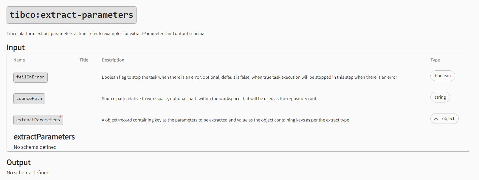 Examples Sample Code Extract parameters when the extract type is XML. steps: - action: tibco:extract-parameters name: Extract parameters input: failOnError: true sourcePath: <Source path> extractParameters: extract_parameter: type: xml filePath: <File path relative to root> xPath: "<Xpath query (Refer: https://www.w3schools.com/xml/xpath_syntax.asp , https://www.npmjs.com/package/xpath)>"Output parameters when the extract type is XML, the value of the output parameter key is always an array. {"output":{"extract_parameter":["<Xpath query output>"]}}Extract parameters when the extract type is XML supporting jsonpath. steps: - action: tibco:extract-parameters name: Extract parameters input: failOnError: true sourcePath: <Source path> extractParameters: extract_parameter: type: xml filePath: <File path relative to root> jsonPath: "<jsonPath query (Refer: https://assertible.com/docs/guide/json-path, https://www.npmjs.com/package/jsonpath)>"Output parameters when the extract type is XML supporting jsonpath, the value of the output parameter key is always an array. {"output":{"extract_parameter":["<Jsonpath query output>"]}}Extract parameters when the extract type is JSON. steps: - action: tibco:extract-parameters name: Extract parameters input: failOnError: true sourcePath: <Source path> extractParameters: extract_parameter: type: json filePath: <File path relative to root> jsonPath: "<jsonPath query (Refer: https://assertible.com/docs/guide/json-path , https://www.npmjs.com/package/jsonpath)>"Output parameters when the extract type is JSON, the value of the output parameter key is always an array. {"output":{"extract_parameter":["<Jsonpath query output>"]}}Extract parameters when the extract type is a file and regex as string. steps: - action: tibco:extract-parameters name: Extract parameters input: failOnError: true sourcePath: <Source path> extractParameters: extract_parameter: type: file filePath: <File path relative to root> regex: "<String or Regular expression to match in the file content (Refer: https://www.w3schools.com/jsref/jsref_match.asp)>"Output parameters when extract type is file and regex as string, the value of output parameter key will be always an array. {"output":{"extract_parameter":["<Regular expression match output>"]}}Extract parameters when extract type is file and regex as object containing regexPattern and regexFlags steps: - action: tibco:extract-parameters name: Extract parameters input: failOnError: true sourcePath: <Source path> extractParameters: extract_parameter: type: file filePath: <File path relative to root> regex: regexPattern: '<Regular expression pattern to match in the file content, Ex: "foo?" (Refer: https://www.w3schools.com/jsref/jsref_match.asp)>' regexFlags: '<Regular expression flags, Ex: "i", "gim" (Refer: https://www.w3schools.com/jsref/jsref_match.asp)>'Output parameters when extract type is file and regex as object containing regexPattern and regexFlags, the value of output parameter key will be always an array {"output":{"extract_parameter":["<Regular expression match output>"]}}Extract parameters when extract type is workspace and regex as string steps: - action: tibco:extract-parameters name: Extract parameters input: failOnError: true sourcePath: <Source path> extractParameters: extract_parameter: type: workspace directoryPath: <Directory path relative to root> glob: "<Glob pattern to find the paths in the directory, optional, default is `**/*` (Refer: https://www.npmjs.com/package/glob)>" onlyName: <Boolean value, optional, default is false, if true will return only file or directory name instead of path> regex: "<String or Regular expression to match the file or directory path (Refer: https://www.w3schools.com/jsref/jsref_match.asp)>"Output parameters when extract type is workspace and regex as string, the value of output parameter key will be always an array {"output":{"extract_parameter":["<Regular expression match output>"]}}Extract parameters when extract type is workspace and regex as object containing regexPattern and regexFlags steps: - action: tibco:extract-parameters name: Extract parameters input: failOnError: true sourcePath: <Source path> extractParameters: extract_parameter: type: workspace directoryPath: <Directory path relative to root> glob: "<Glob pattern to find the paths in the directory, optional, default is `**/*` (Refer: https://www.npmjs.com/package/glob)>" onlyName: <Boolean value, optional, default is false, if true will return only file or directory name instead of path> regex: regexPattern: '<Regular expression pattern to match the file or directory path, Ex: "foo?" (Refer: https://www.w3schools.com/jsref/jsref_match.asp)>' regexFlags: '<Regular expression flags, Ex: "i", "gim" (Refer: https://www.w3schools.com/jsref/jsref_match.asp)>'Output parameters when extract type is workspace and regex as object containing regexPattern and regexFlags, the value of output parameter key will be always an array {"output":{"extract_parameter":["<Regular expression match output>"]}} -