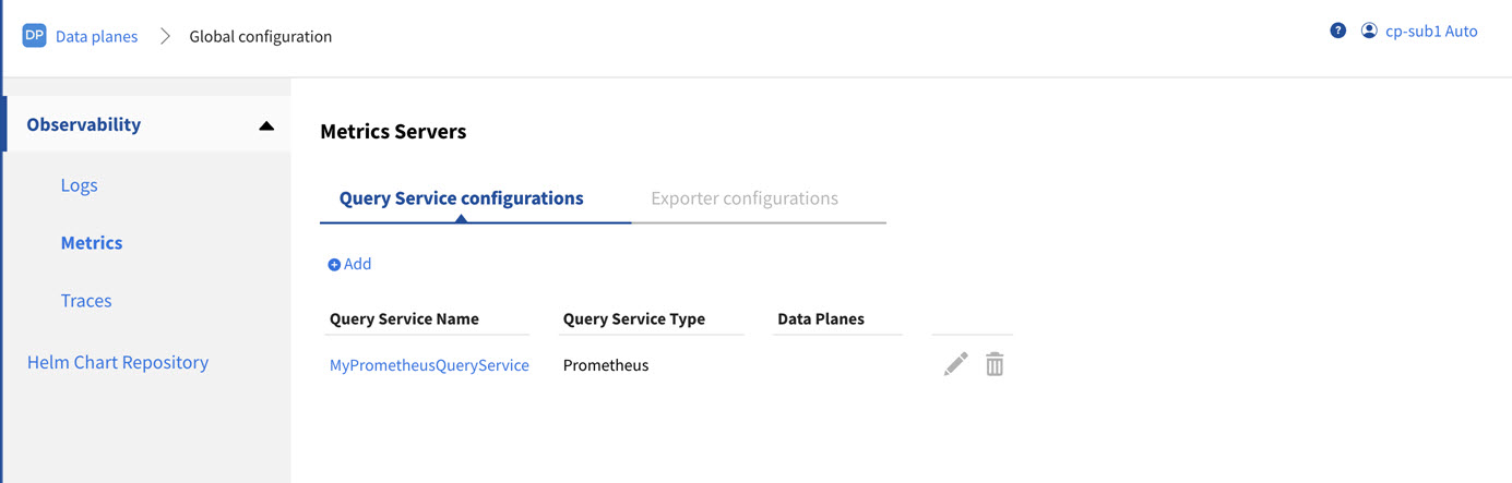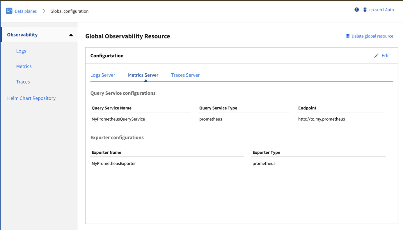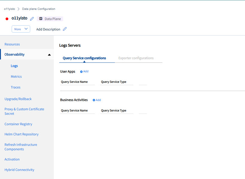 The listings of the Query Services and Exporters under the sub tabs of Logs, Metrics and Traces servers display only those that are created for this data plane. You cannot view the Query Services and Exporters that are created in the Global Observability resource configuration.