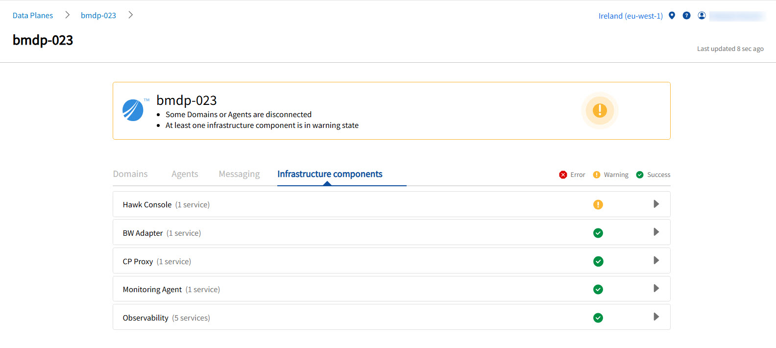 For example, if the bwprovisioner service for the BW6 (Containers) capability is in error state, the BW6 (Containers) capability displays the error status and therefore the data plane displays the status as error. Health monitoring for capabilities only takes into account the mandatory components required for the capabilities to function successfully.