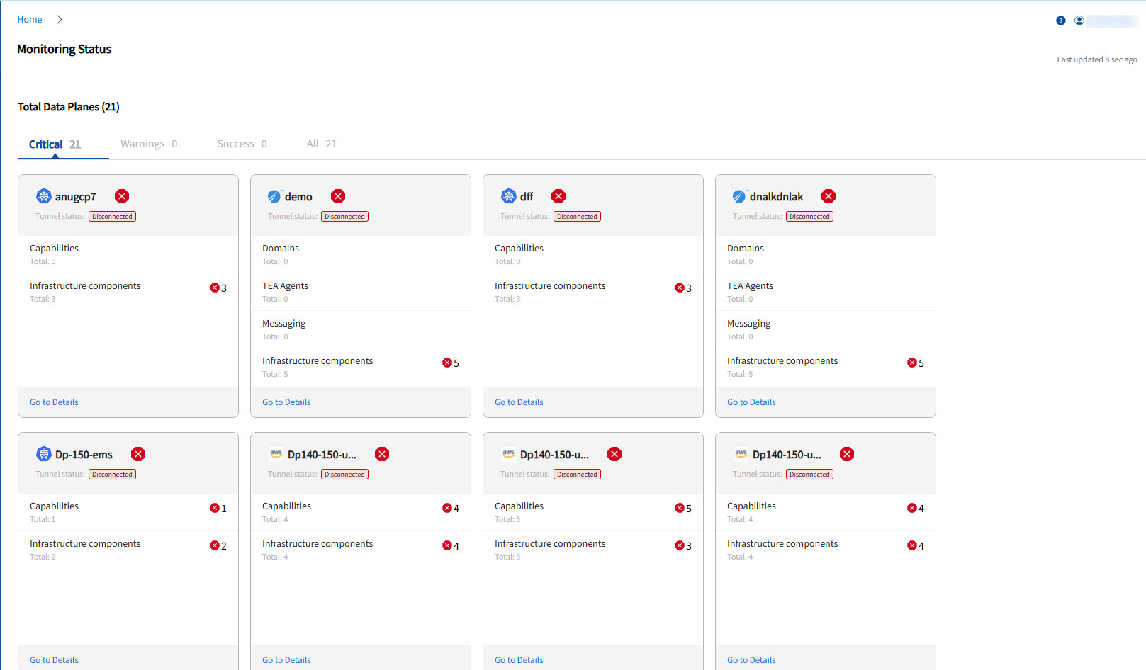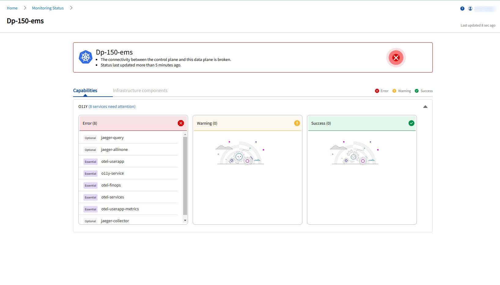 The Monitoring details page displays the runtime status of all the data planes and capabilities provisioned on the data plane. The data plane status is a rollup of health status of all the capabilities and infrastructure components deployed on the data plane. The Capability status is the rollup of health status of capability services.