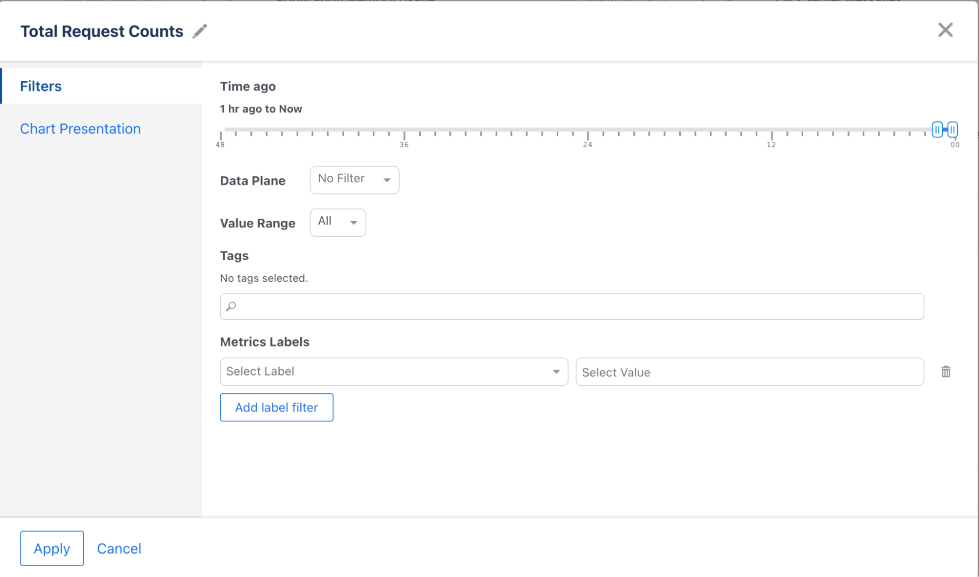 Filter data points based on the number of hours ago (up to 48 hours). The default is the last hour.