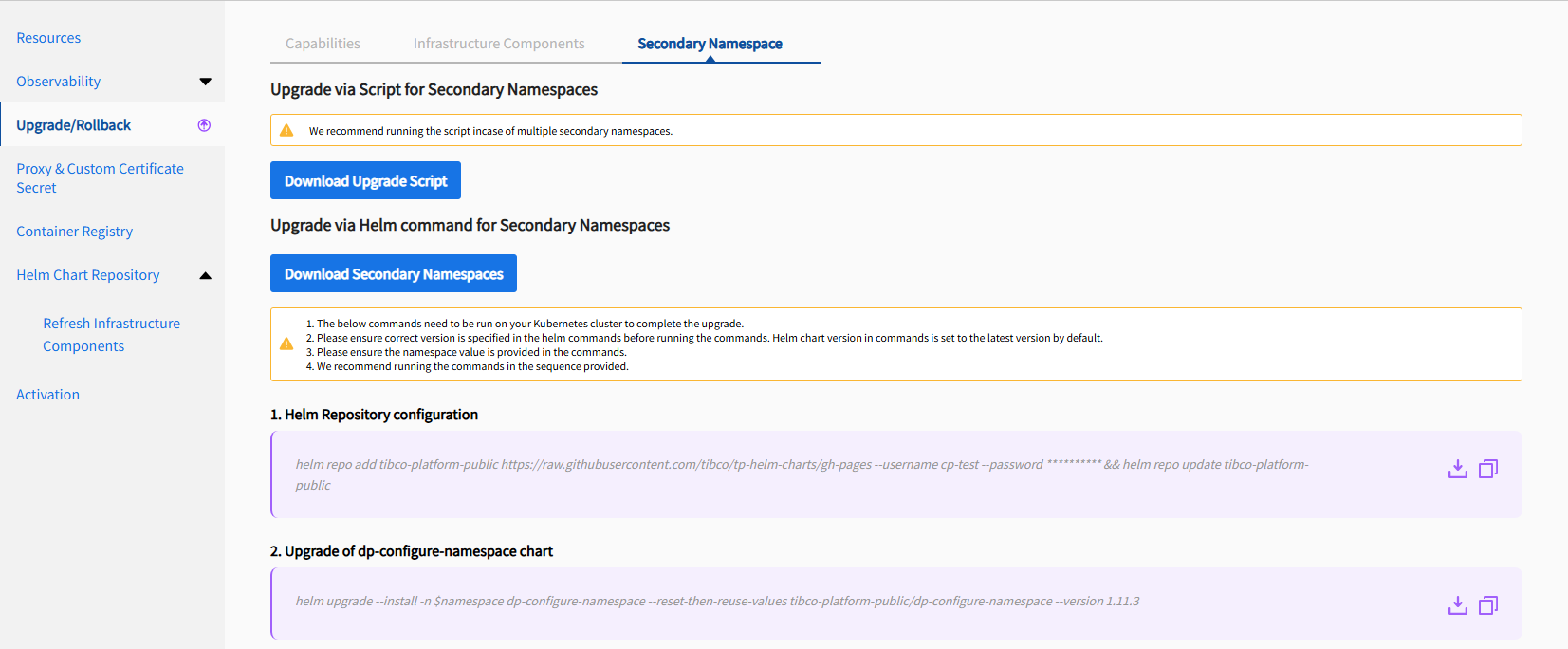 dp-configure-namespacechart is displayed. Command for Helm repository configuration is displayed. Copy and run the commands in your Kubernetes cluster. Alternatively, you can also download and run upgrade script which will run these all commands.Note: If you have multiple secondary namespaces, only a single namespace can be upgraded by using commands displayed on UI. By using upgrade script all the secondary namespaces available can be upgraded.