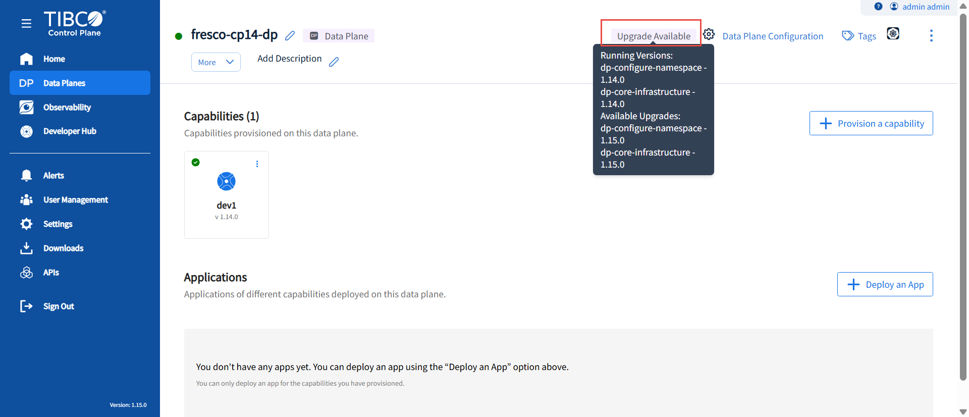 - You must do a Control Plane upgrade first before upgrading data plane infrastructure components. After TIBCO Control Plane upgrade, you will see an upgrade available for data planes and capabilities.