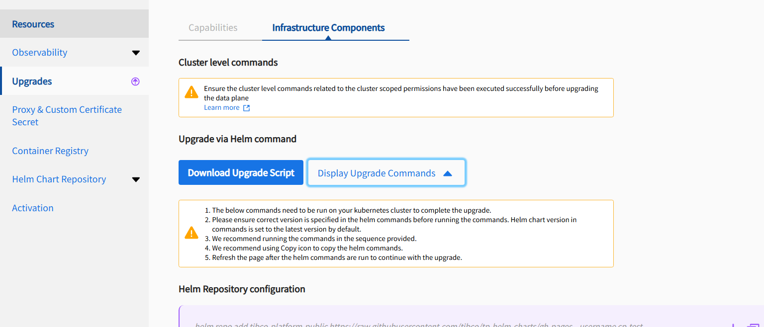 dp-configure-namespaceordp-core-infrastructurecharts is displayed. Command for Helm repository configuration is displayed. Copy and run the commands in your Kubernetes cluster. Alternatively, you can also download and run upgrade script which will run these all commands.If only