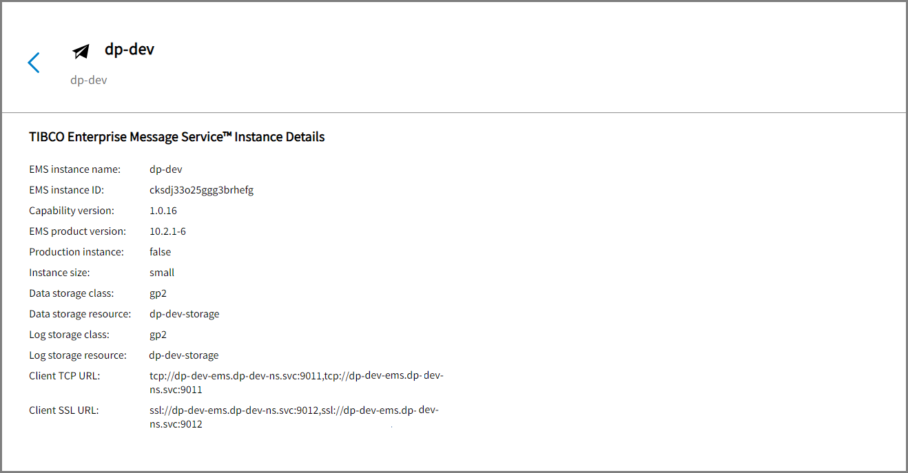 Once you have provisioned EMS, you can view the instance details on the TIBCO Enterprise Message Service Instance Details page.
