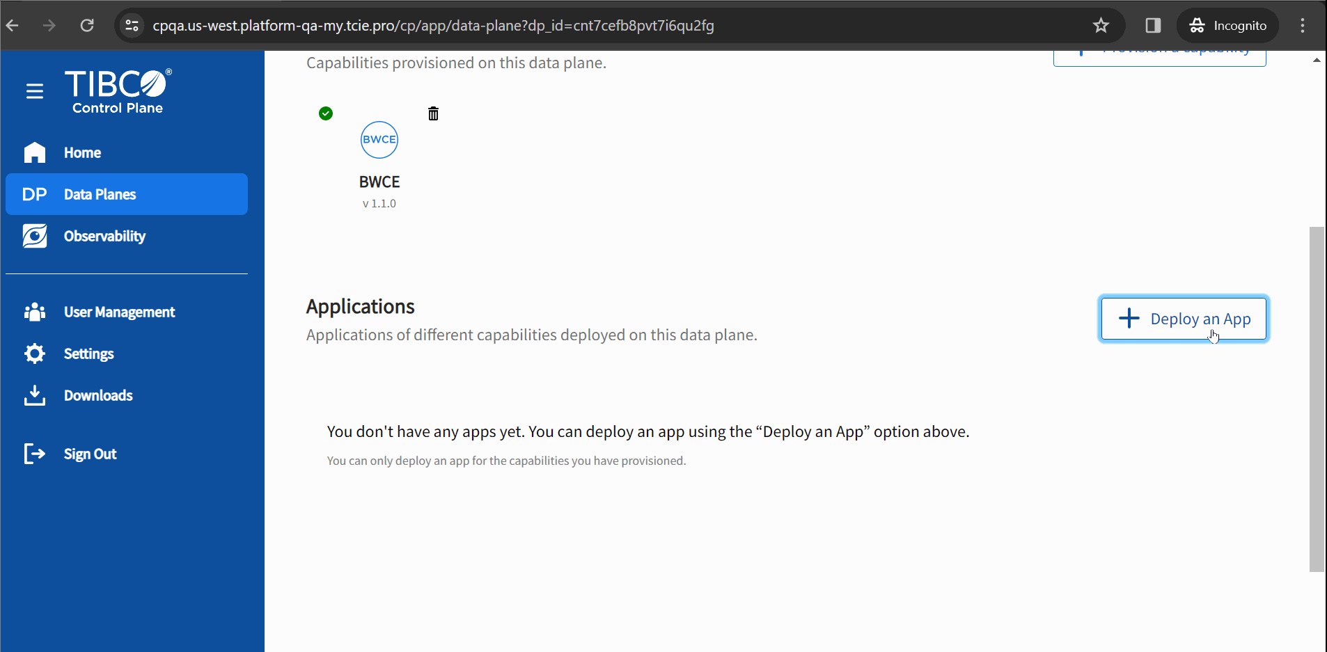 After you have provisioned a capability, you see that a capability card gets added on the data plane details page. In the next step, you have to deploy a BWCE app on the data plane.