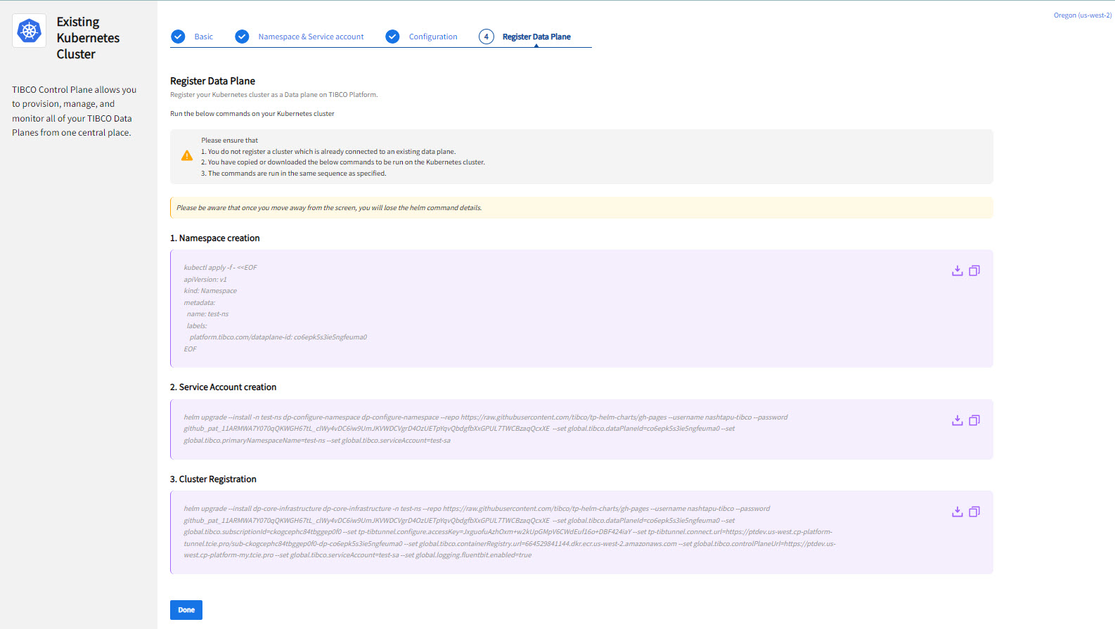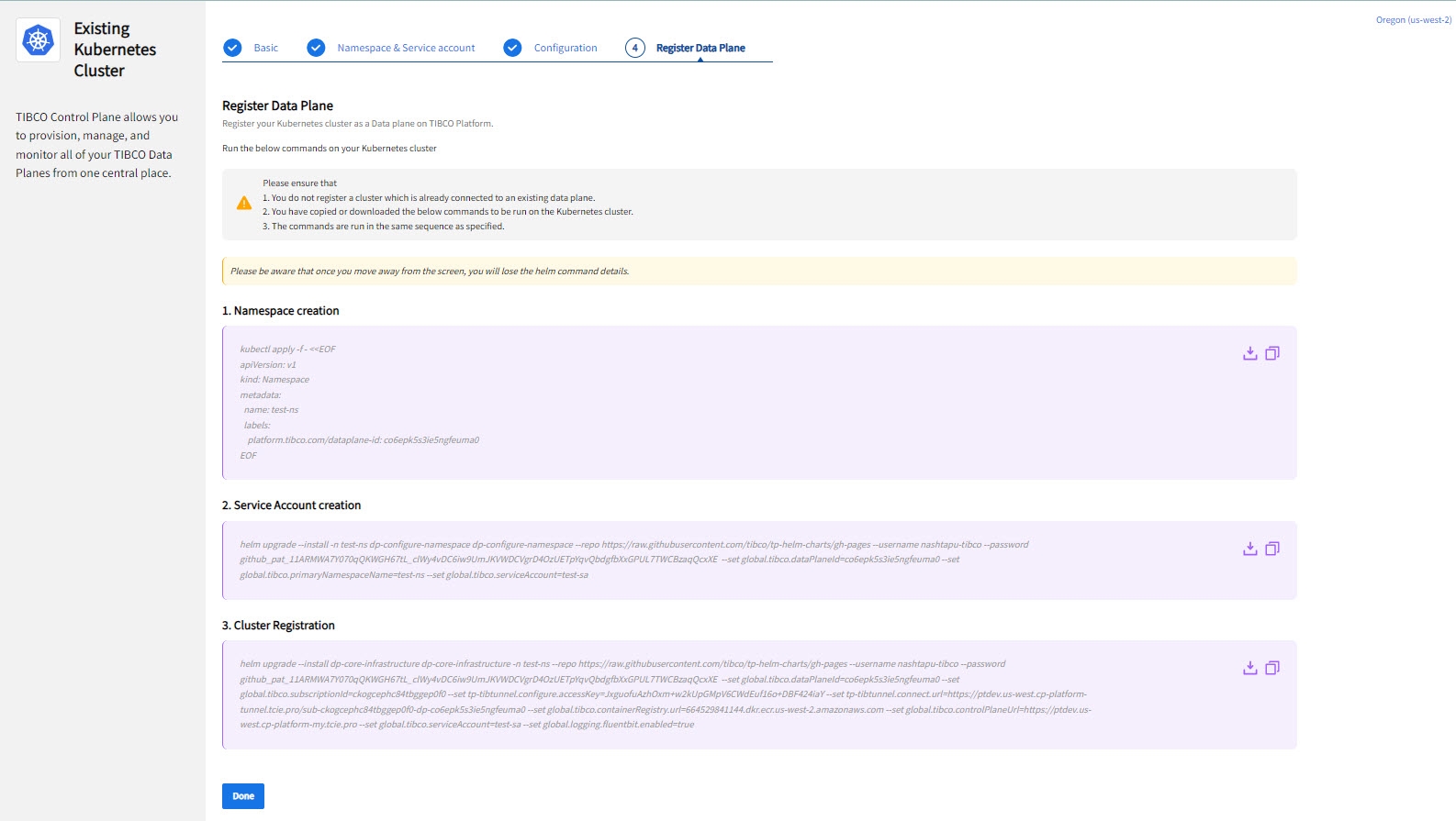 On the Register a Data Plane page, the helm commands for namespace creation, service account creation, and cluster registration are provided. Run the helm commands in your Kubernetes cluster in the sequence specified on the screen. It is mandatory to run all three commands whether you have existing namespace and service account or you want to create new one. Cluster Registration command deploys TIBCO Control Plane Infrastructure Components in your Kubernetes cluster, which are required to manage and monitor the data plane by using TIBCO Control Plane.
